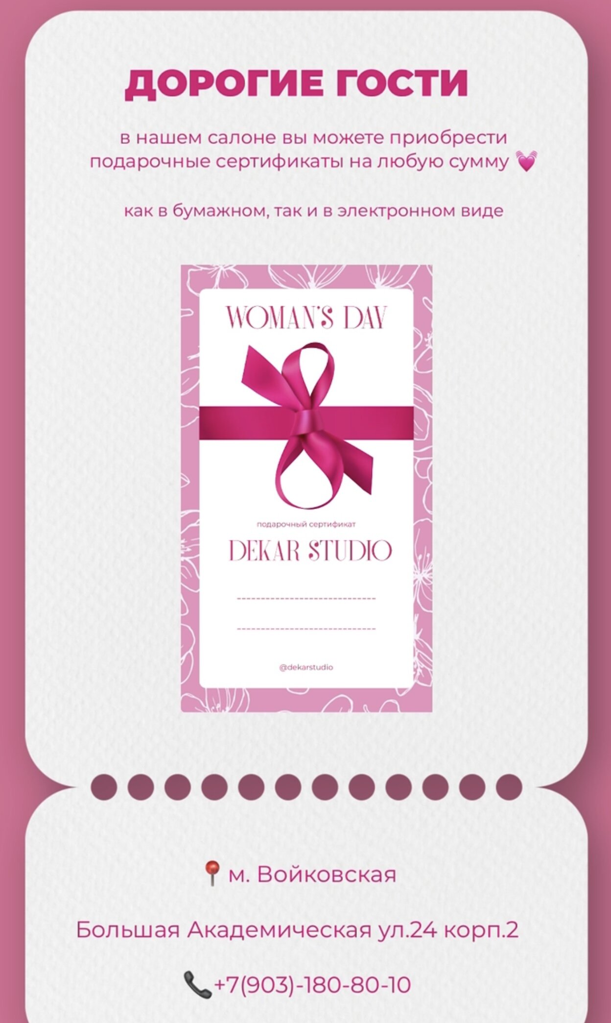 Мне нравится обстановка в студии, она всегда благоприятная и доброжелательная. Не первый раз посещаю ее, меня стрижет мастер Карен и качеством его работы я довольна. Прическа легко укладывается и не надо никаких заморочек. Так как я проживаю в другом городе, когда приезжаю к сыну в Москву, захожу в De`kar studio и кроме нее, специально никуда не хожу для стрижки!